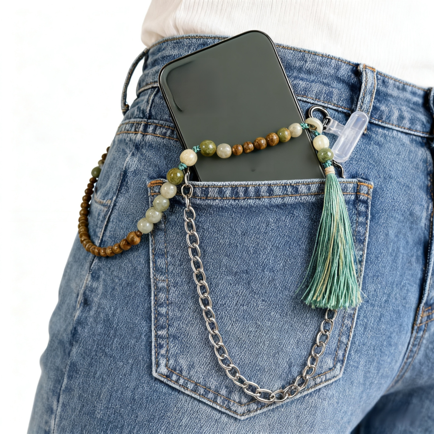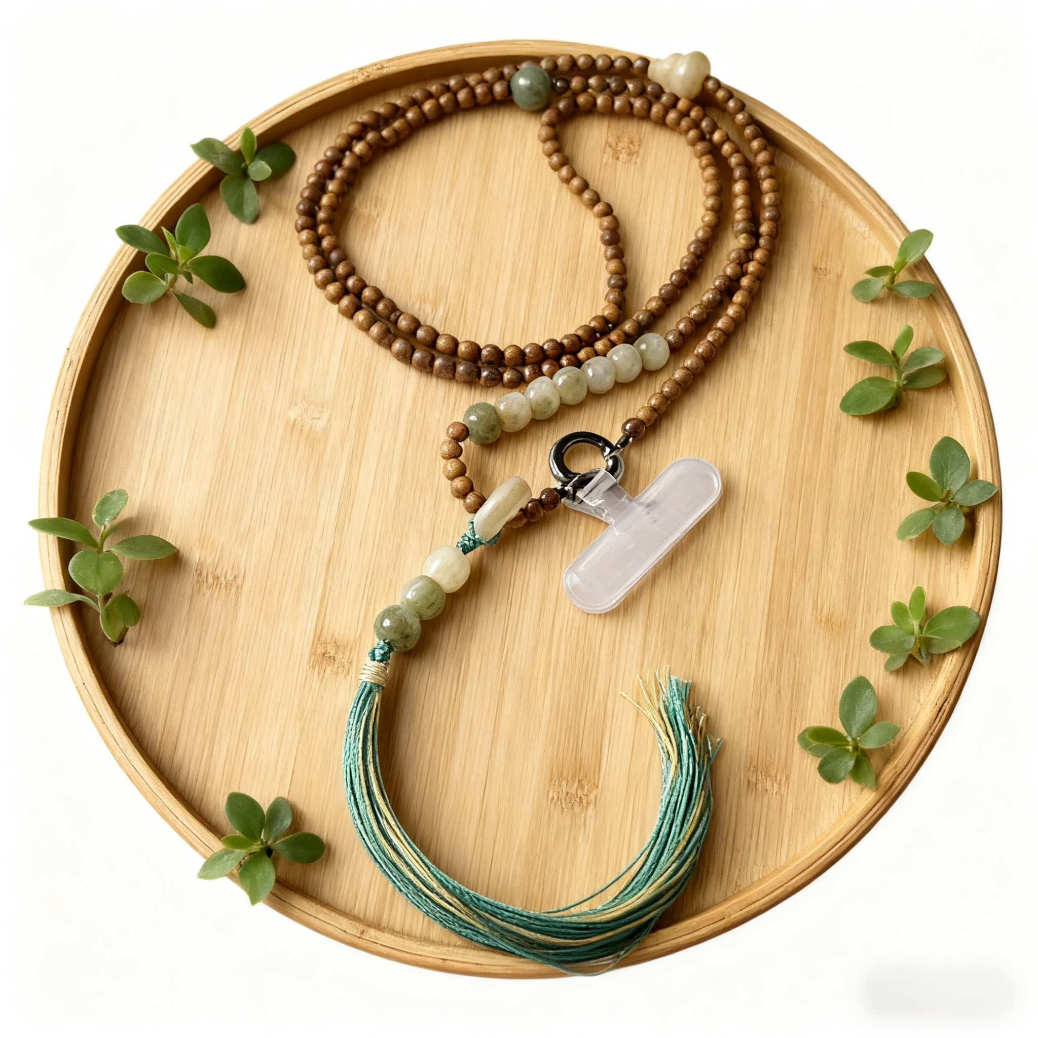 Exklusive chinesische Handy-Kette aus grünem Sandelholz und Bodhi-Perlen